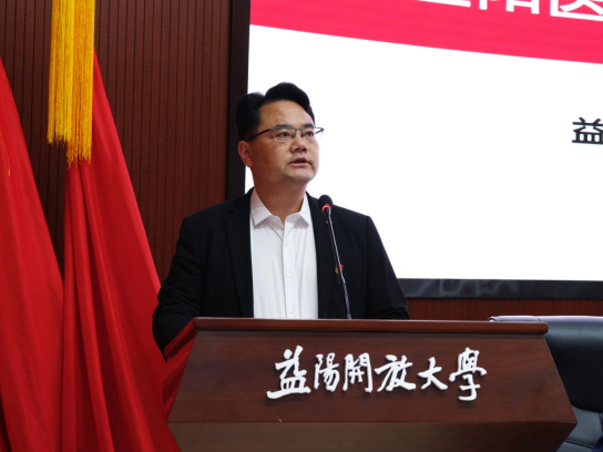 湖南开放大学发展规划与系统建设处处长徐志平、湖南开放大学宣传统战部常务副部长李涌涛,市委教育工委委员、市教育局党组成员、副局长何立山,市委统战部无党派人士与党外知识分子工作科科长蒋自贵,益阳医专、益阳师专宣传统战部负责人,学校在家的校领导出席会议,学校全体教职工参会。