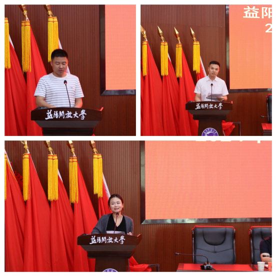 在师德先进个人表彰环节,党委委员、工会主席易新宣读了表彰文件,田超等10位同志被评为校级“师德先进个人”,推荐易卓同志为省校“师德先进个人”候选人。在热烈的掌声中,主席台领导为师德先进个人颁发了荣誉证书。获奖教师代表田超、易卓、郭泽青同志依次上台发言,他们分享了自己在岗位上的点滴故事和深刻感悟,表达了对教育事业的热爱和执着追求。他们的发言情真意切、感人肺腑,不仅展现了益阳开放大学教师的风采和魅力,也激励了全体教职工继续前行、勇攀高峰的决心和信心。