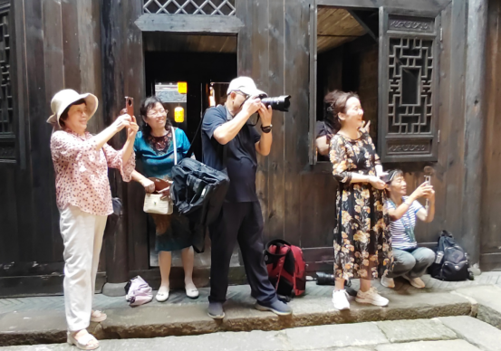 初学摄影的学员们则紧随其后,认真观摩,不时用手机记录拍摄过程,快门声、交流声与古巷的幽静相映成趣。