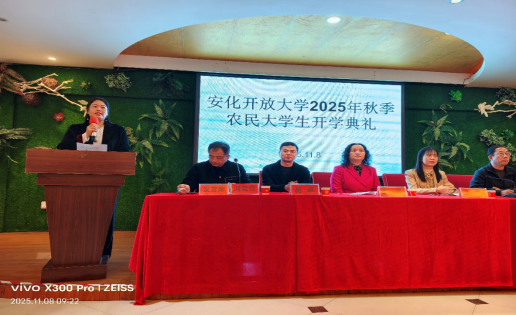 11月8日,安化开放大学在东坪镇坪益酒店隆重举行2025年秋季学期农民大学生新生开学典礼。来自安化全县各乡镇的168名新生齐聚一堂,开启为期两年半的学习征程。益阳开放大学党委委员、副校长刘燕,益阳开放大学开放教育学院主任易卓,安化县教育局党组成员、总督学王俏和安化开放大学校长李拥军等领导出席典礼并致辞。典礼由安化开放大学副校长刘定芳主持。