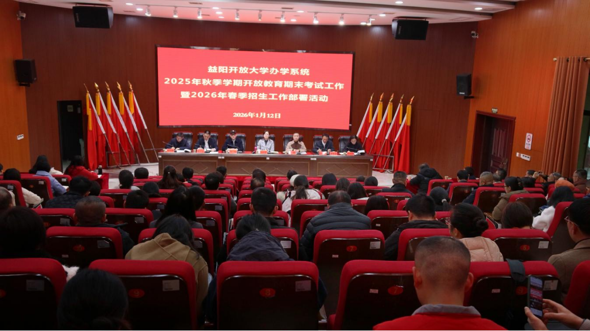 1月12日,益阳开放大学召开2025年秋季学期期末考试和2026年春季招生专题会议。各区县(市)开放大学和教学点校长、分管考务工作副校长、分管招生工作副校长、考务专干、招生专干,益阳开放大学全体教职员工共计150余人参加会议,学校党委委员、副校长周程宏主持会议。