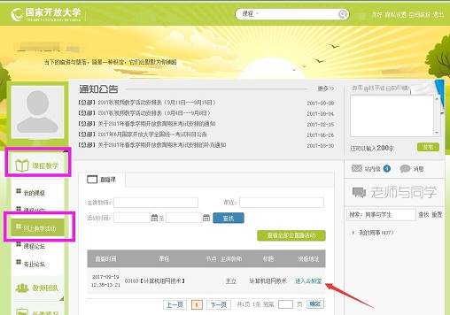 2.进入空间后,在左侧导航栏:课程教学—网上教学活动。(备注:目前只能在活动开始前10分钟在网上教学活动中查看到,点击即可参加)