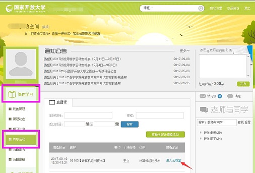 2.进入空间后,在左侧导航栏:课程学习—教学活动。(备注:目前只能在活动开始前10分钟在教学活动中查看到,点击即可参加)