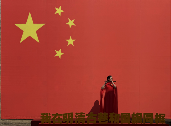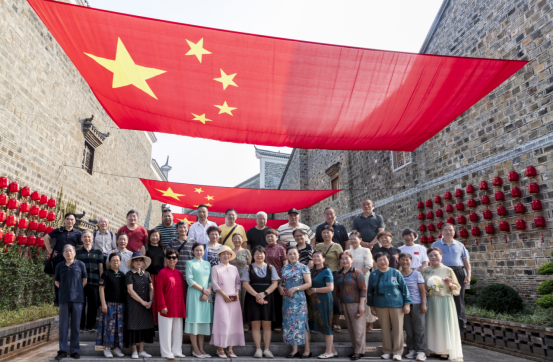 尤为动人的是许班长拍摄的一组国旗主题作品。适逢国庆,巷内悬挂的国旗与身着正红色衣裙的学员尹新佩相映成辉,庄重而富美感。