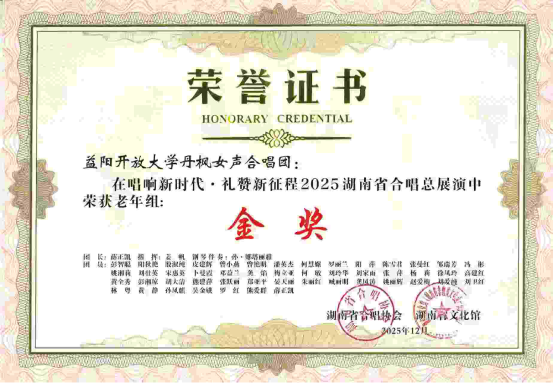 2025年12月28日至29日,益阳开放大学丹枫女声合唱团参加了“唱响新时代,礼赞新征程”2025湖南省合唱总展演。益阳开放大学丹枫女声合唱团此次参赛作品为《桃花红杏花白》和《女人花》。她们音色纯净和谐,情感细腻丰富,将女声的柔美与力量完美结合,在老年组的角逐中脱颖而出,以9.762分荣获金奖,钢琴伴奏孙·娜塔莉亚获得最佳钢琴伴奏奖。
